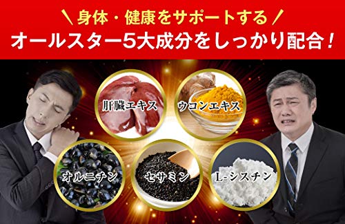 [原材料・成分]豚肝臓エキス、オルニチン、ウコンエキス、黒ゴマエキス(セサミン含有)、L-シスチン、結晶セルロース、HPMC、ステアリン酸Ca,糊料(MC,CMC-Ca)、ケイ酸Ca,HPC、カラメル色素、グリセリン