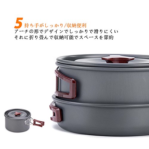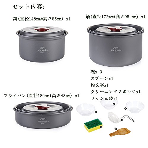 ランド:tentock 素材:アルミ製(アルマイト加工) 重量:約0.68kg 収納セットサイズ:190*100-180mm セット内容:鍋(直径148mm*高さ85mm) x1 鍋(直径172mm*高さ98 mm) x1 フライパン(直径180mm*高さ43mm) x1 碗x 3、スプーンx1、杓文字x1、 クリーニングスポンジx1、メッシュ袋x1 原産地:中国