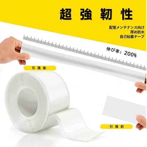 特長:ぽたぽた落ち漏水、滲み補修。圧力がかかっている状態で補修できます。テープ同士が自己融着することで、簡単に補修を行うことができます。接着剤不使用、ゴムの伸縮性と密着力でテープ同士が融着し、破損部分や隙間を塞ぎます。