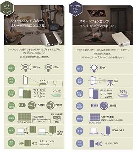 こちらのモバイルプロジェクターは、DLP方式という投影方式を採用している商品です。映像の色の再現性や、精細性に優れているモバイルプロジェクターです。密閉性が高いために、チリやホコリなどからも強いので耐久性があります。とてもコンパクトなサイズで持ち運びに便利で、携帯しておく事も可能です。