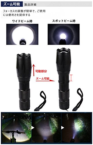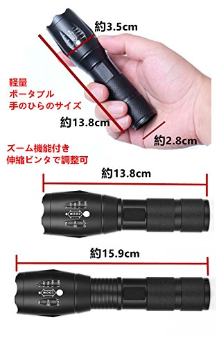商品名 / XML〜T6 高輝度 LED 自転車ライト クラス / アメリカGREE XML〜T6 電力 / 10W 発光色 / ホワイト LED寿命 / 10万時間 レンズ / 凸レンズ 照明の距離 / 最長500m 明るさ / 800ルーメン 5つのモード / 高/中/低/ストロボ/ SOS信号 電源 / 18650リチウム電池1個《含まれていません》,または,単4型乾電池3個《含まれていません》 入力電圧 / 3.7v。稼働時間 / 2〜4時間 素材 / 航空機グレードのアルミ合金。色 / ブラック 外形寸法 / 縮小時《スポットビーム時》全長 / 13.8cm。レンズ側幅 / 3.5cm。電源スイッチ側幅 /