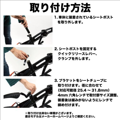 ATB、クロスバイク、ロードサイクル、折り畳み車、コンパクト車など幅広い車種に対応するシートポストに装着するだけのワンタッチのリア用泥除け。もちろん取り外しも簡単です。