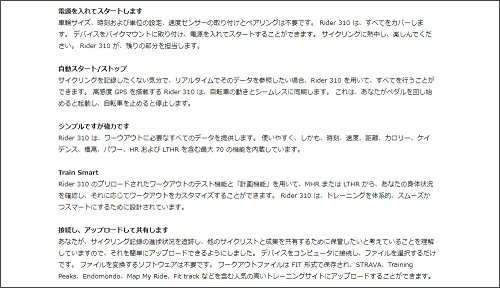 モデル / Rider 310 センサーが付属していない単体モデルのサイズ / 45.1x 69.5×17.3mm 重量 / 56g ディスプレイ / 1.8"LCD バッテリーの稼働時間 / 36時間 GPS / 高感度チップセット 防水機能 / IPX7 ワイヤレス 通信 / 2.4 GHz ANT+, Bluetooth Smartワイヤレステクノロジー アラート / あり ラップヒストリー / 130ラップ ログヒストリー / 300時 心拍数 / 7ゾーン 操作温度 / -10C°-50C°