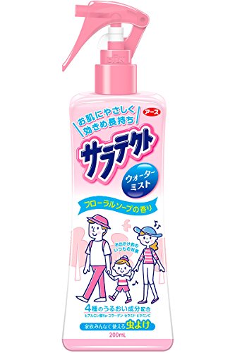 アース製薬の虫除けサラテクトシリーズです。お子様から大人まで家族みんなで使える虫除けスプレーで、お肌に優しいウォーターインです。香りもよくフローラルソープの香りがします。使用方法は腕・足などには10センチから15センチの距離からスプレーしましょう。顔・首筋には一度手のひらにスプレーしてから肌に塗り込んでください。