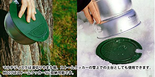 トランギアのクッカーにスタックできるので、収納もかさばりません。このディスクで湯切りができるので、簡単に美味しいパスタができます。またはフィールドでお湯を大事にしたい場合は、湯切りのお湯でスープを作ることも可能です。このディスクは様々な使い方ができ、料理の湯切りだけでなく料理の際の蓋にも、まな板にもなり、ストームクッカーの土台にも使える万能アイテムです。