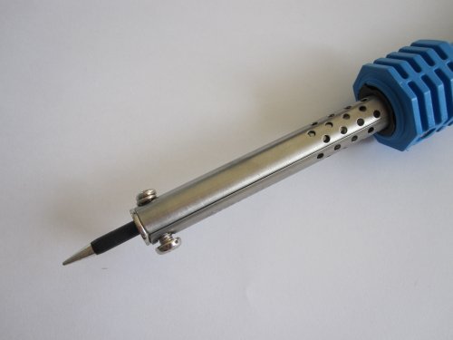 はんだごての中でも最もポピュラーなのがニクロム式のはんだごてです。AC電源からの給電でこてをニクロム線で加熱する方式をとっています。基本的なはんだごての形状をしていて、放熱用の穴が空いているのがポイントです! 起動してからはんだ付け出来るまでの熱の伝わりは遅いですが、最終的な温度は非常に高くて様々なものに使えます。初心者がはんだごての使い方を知るのにはもっともおすすめです!