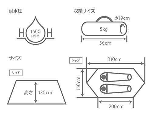 出典: http://www.dod.camp/file/2017/12/size-1.jpgサイズ:約W310×D150×H130cm(寝室部のみ) 収納サイズ:約直径19×長さ56cm 重量:約5.0kg 収容可能人数:2人 付属品:ポール・ペグ・ロープ・キャリーバッグ