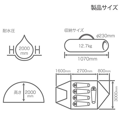 出典: https://images-na.ssl-images-amazon.com/images/I/61ezTlYBs%2BL._SL1201_.jpgサイズ:約W300×D380×H176cm インナーサイズ:約W290×D230×H165cm 収納サイズ:約直径22×長さ98cm 重量:約8.2kg 収容可能人数:5人(寝室スペース) 付属品:ペグ・ロープ・キャリーバッグ