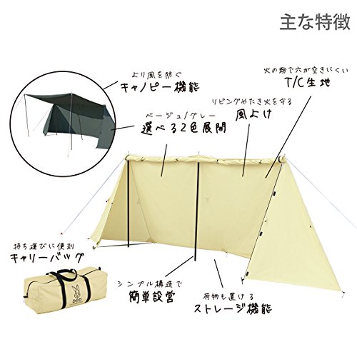ベージュとグレーの2色展開です。キャノピー部にオプションのキャノピー用ポールを立てれば、高い範囲の風除けにもなります。 かまぼこテントのサイドをフルオープンにして、カベテントを設置すれば、プライベート性も抜群のサブアイテムです。