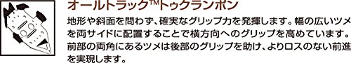 一般的なスノーシューです。ハードな使用はしないので、靴に付ける部分の機構が簡単にできており、履き方が比較的簡単で、脱着が楽です。また、滑り止めの爪が深くないので、歩行時の取り回しが楽になっています。しかし、その反面、傾斜部分でのグリップが少なく、軽量化が図られていませんが、価格は安くなっています。緩やかな雪原や森の中を歩くスノーシュートレッキングに向いています。