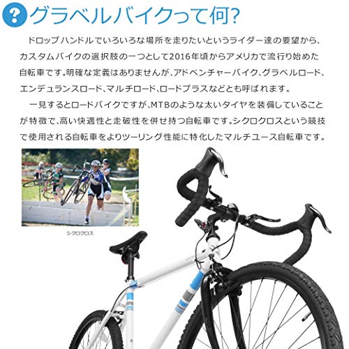 グラベルロードですが軽量なアルミフレーム、44cm、48cmには650Bロードプラスタイヤを採用し快適な走行性能があります。グラベルロードもロードバイク同様に車体が軽いほど走行性が増し本品はグランドシートとしては非常に軽い10.8kgしかありません。