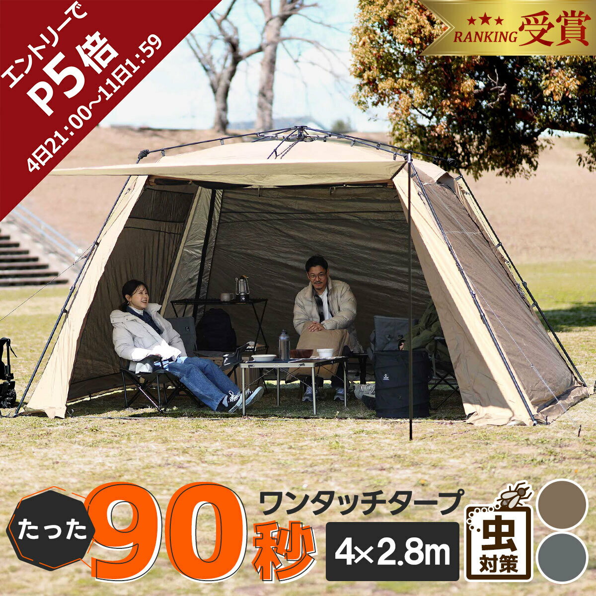 さらに大きな4m×3mのスクリーンタープなのですが、設営は折りたたみ傘を広げる感覚のワンタッチタイプなので、90秒で簡単に設営できてしまうというフルクローズタイプのおしゃれなスクリーンタープになっています。