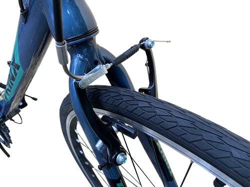 また、こちらのクロスバイクのフレームにはアルミを使用しており、錆びづらいのがポイント。軽量設計のクロスバイクなので、女性でも扱いやすいです。Vブレーキを搭載し、段差のある場所でも問題なく走行可能となっています。