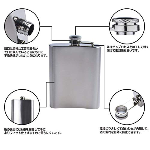 素材にステンレスを採用し作っている為、サビに強く軽量感があり頑丈な仕様なので長く愛用することができます。220mlの容量なのでたっぷりとお酒を入れる事ができアウトドアシーンに持ち運びする事が出来ます。スキットルの中身にお酒を注ぐ際は、小型のじょうごを用いればスムーズに注ぐ事が出来ます。