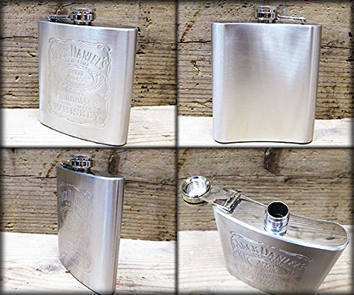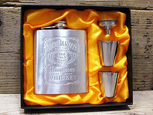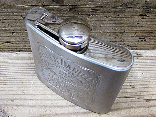 存在感抜群のジャックダニエルのフラスクセットです。このフラスク(スキットル)はステンレス製で、正面にジャックダニエルズのデザインがエンボス(凸型押し)で描かれています。サイズはポケットに入れやすい7オンス(約210ml)。お酒をボトルから注ぐときに活躍するステンレス製漏斗と、ステンレス製ショットが2カップ付属しているのが特徴です。