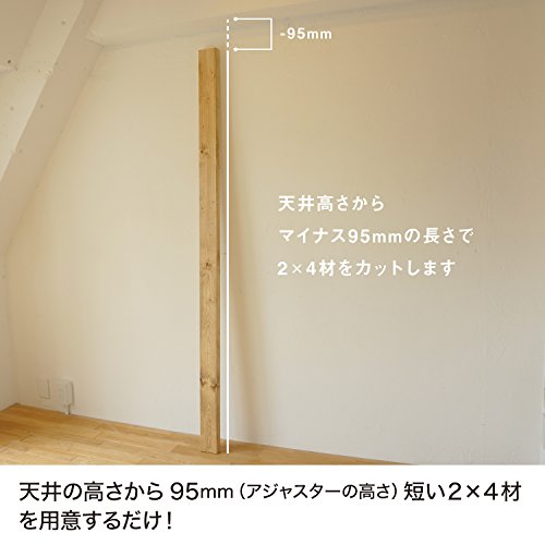 適切な長さに切り出した2×4の木材の上と下にアジャスターをかぶせたあと、木材を立てて上部のネジを締めれば柱の完成です。この時にアジャスターのネジが付いた側が上に来るようにしないと固定できません。ネジを回すことでしっかり突っ張ることができます。後述する類似品のディアウォールと比較するとしっかり突っ張るので天井がベニヤ板一枚でできているような所ではあまり突っ張れない可能性があるので注意してください。