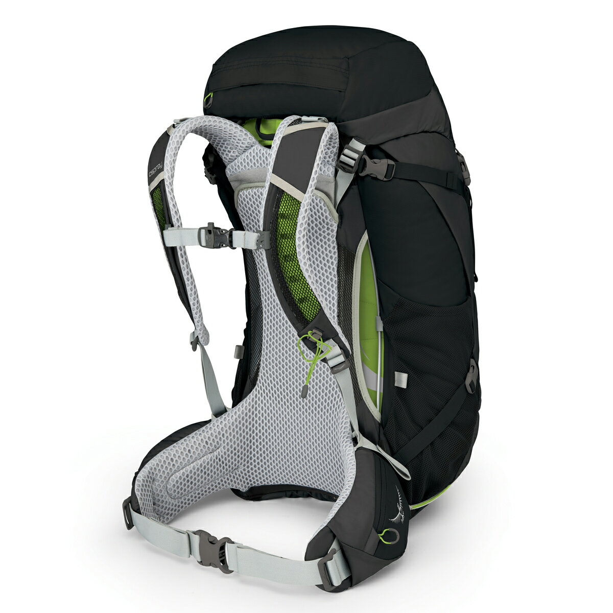 オスプレー「ストラトス」の全種類に共通するシステムとして、エアースピードサスペンションが搭載されています。背面の周囲に金属性のフレームを施し中心部にデュアルストラットを装備。背面のメッシュパネルにテンションをかける構造で、荷重の安定と身体へのフィット感が工夫されています。また、スペーサーメッシュを使用したショルダーベルトとヒップベルトを採用することで、より快適なフィット感を味わえるのが特徴です。