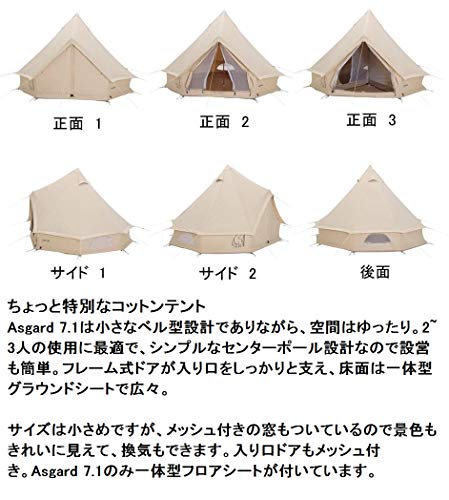 通常販売されているアウトドアブランドのテントとは構造が全く違うのがベル型のテントです。アスガルドはベル型はで真ん中にポールを立てる構造でテントのサイドが少し立ち上がっているのでベルのような形をしていることが特徴的で、呼称はさまざまで、ベルテント、パオ型、ゲル型とも呼ばれていています。同じノルディスク製品にティピー型のテントがありますが、ティピー型は円錐形をしているのが特徴で違いがあります。