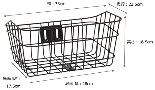 サイズ〈約〉|上口340 × 250mm / 下底300 × 180mm / 高さ110~160mm 材質|スチール 専用フロントキャリア付き〈カンチ台座付車のほとんどの自転車に取り付け出来ます〉 最大積載|3kg