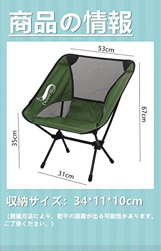 ●使用時サイズ:幅52cm×奥行き53cm×高さ67cm●収納時サイズ:幅37cm×奥行き10cm×高さ12cm●座面の高さ:34cm●使用時:910g●収納時:1020g●耐荷重:145kg●フレーム素材:金属(アルミニウム合金)、樹脂、ヒンジ●先端部素材:ナイロン●張り材素材:ポリエステル●収納袋素材:ナイロン●表面加工:フレーム(アルマイト)