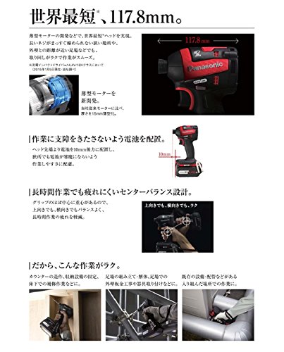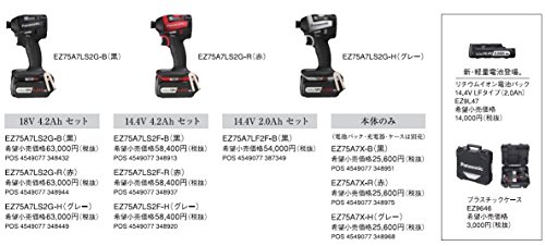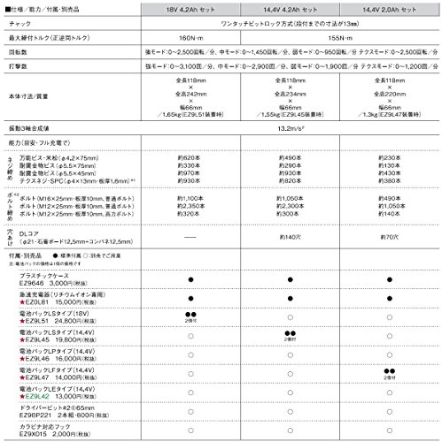 サイズ:117.8mm(ヘッド) カラー:ブラック(他にレッドとグレー有り) 全長サイズ:118mm×全高234mm×幅66mm (EZ9L45装着時) 最大締付トルク:155N・m チャック:ワンタッチビットロック方式(段付までの寸法が13mm) 電池パック:電圧=DC14.4V、 容量=4.2Ah (LSタイプ、リチウムイオン)