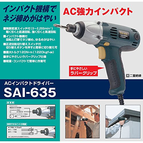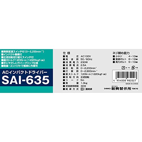 ランキング14番目に紹介するおすすめのインパクトドライバーは新興製作所 AC インパクトドライバー SAI-635です。このインパクトドライバーは何といっても価格が安いです。価格は5,980円、これまで紹介した中で一番安い価格です。コード式でもよいから安いインパクトドライバーが欲しい初心者におすすめのインパクトドライバーです。
