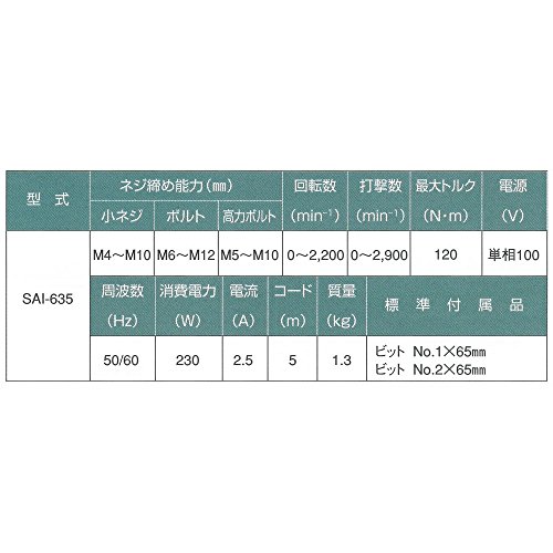 サイズ:幅210 x 奥行き63 x 高さ170mm 重量:1.3kg ネジ締め能力:M4~M10(小ネジ)、M6~M12(ボルト)、M5~M10(高力ボルト) 最大トルク:120N・m コード:5m 電圧:100V 周波数:50/60Hz