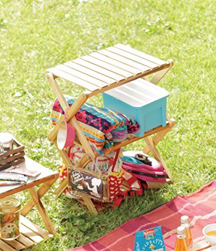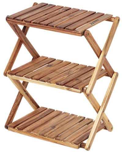 こちらは、キャプテンスタッグの木製3段ラックです。キャプテンスタッグの木製ラックは、2段、3段、4段の3種類のバリエーションがあります。また、幅が460のタイプと600のタイプがあります。耐荷重については、1枚の棚板につき10キログラムあるので、しっかりとしたつくりになっています。キャンプをするときには、このようなラックがあると荷物の整理に大変便利です。