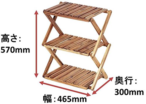 ・組立サイズは、(約)幅465×奥行300×高さ570mmです。 ・収納サイズは、(約)465×400×厚さ90mmです。 ・重量は、(約):3.0kgです。 ・耐荷重は、(約):棚板1枚10kgです。 ・材質は、構造部材:天然木(表面加工:オイルステイン)です。 ・原産国は、ベトナムです。