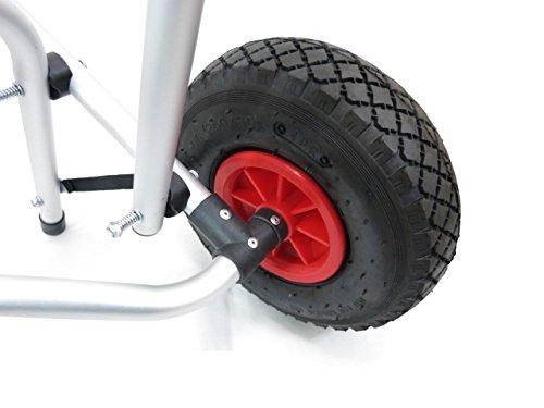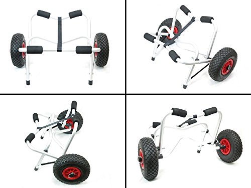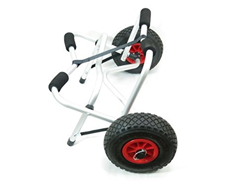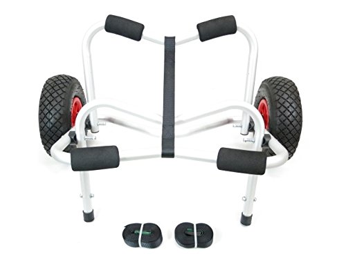 【製品情報】カヤックを車や置場から水面までに移送するための道具です。カヤックは柔らかい砂浜や芝生の上などでは、引き摺って移送する事も可能です。また1人用のフィッシングカヤックなら、持って運ぶ事も可能ですが、落とす危険、腰を悪くするリスクが付きまといます。特に、たっぷりと巡航して腰に負担が掛かったあとの帰路での移送は、ぎっくり腰になっても不思議ではありません。その為、必須のおすすめの道具として装備する事をおすすめします。載せてバンドで固定するだけで楽ちんです。