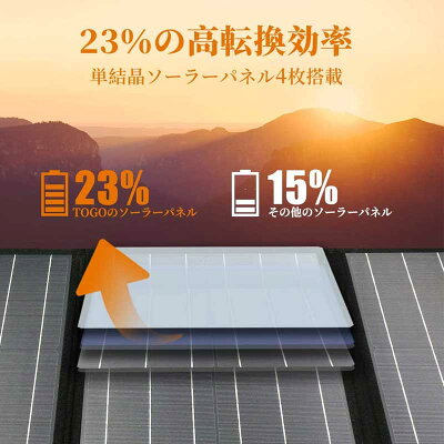 4枚の単結晶ソーラーパネルで効率的かつ安定した発電ができる、モバイルソーラーチャージャーです。高い互換性をもち、アダプタ経由でさまざまなポータブル電源に充電できるのが魅力です。