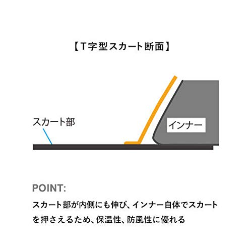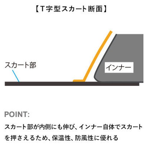 スカート部分が内側にも伸場してある設計になっているので、インナー自体でスカート自信を抑えることができるので、保温性や防風性に優れたスノーフライになります。