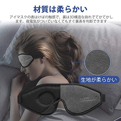 こちらの3D立体型のアイマスクは、高い遮光性を持っている特殊なデザインで、外部からの光を完璧に遮断してくれますので、視界に邪魔が一切入らず快適に眠る事が出来ますので重宝して使用する事が出来ます!素材には通気性に優れていて、柔軟性に富んでいる繊維が活用されていて、シルクのような柔らかい質感を実感する事が出来ます。