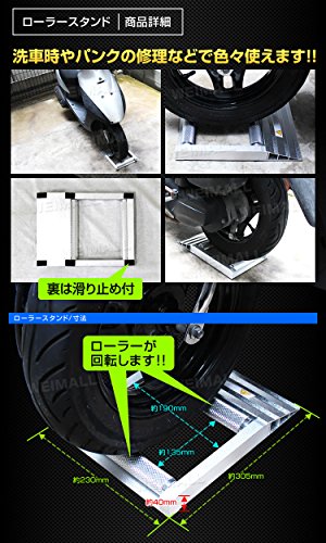 軽量純アルミ製で持ち運びが楽です。タイヤ下にローラスタンドを設置し、タイヤを回転させることができるので、ホイールやタイヤの洗浄が楽になります。ベアリング入りで回転がスムーズです。