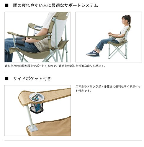 腰をケアできるアウトドアチェアであることと、ナチュラルで落ち着きのある色合いのカラーと、軽量でコンパクトに収納できるスリムタイプであること、サイドポケットがついているので、キャンプやバーベキューでは十分な作りであることがおすすめポイントです。