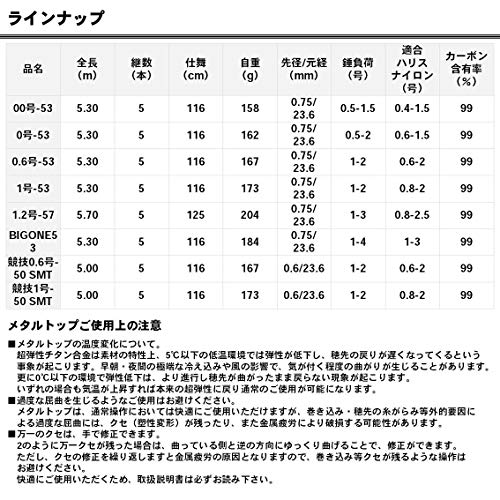 ◆ 長さ: 500cm ◆ 自重: 116g ◆ 適合オモリ負荷: 1 - 2号 ◆ 適合ハリスクラス: 0.6 - 2号 ◆ トップ: 「SMT」テクノロジー採用チタン合金トップ