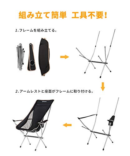 サイドのメッシュ部分はひじ掛けとしても利用できます。フレームと本体を取り外すことができるので、持ち運びの際は小さく収納が可能です。また、ハイバックタイプのアウトドアチェアなので、背中を安心して預けることができます。