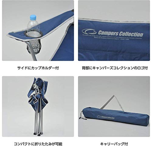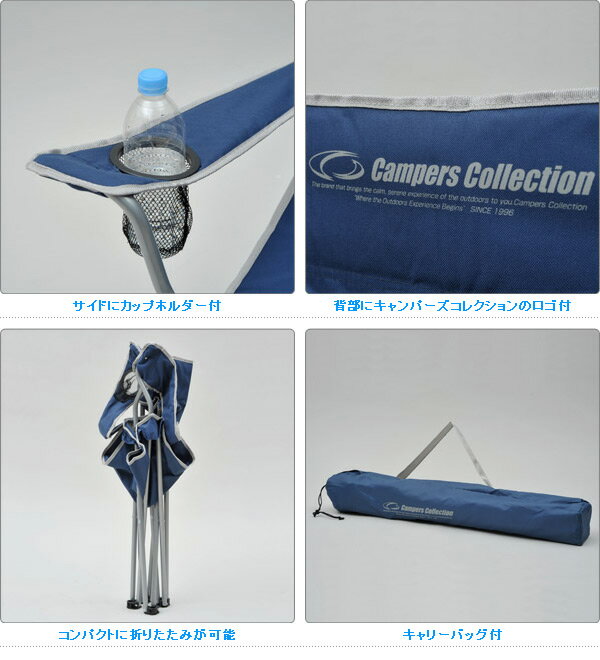 アウトドアレジャーで快適に座る事が出来るアウトドアチェアになります。不必要時はコンパクトに折りたたみする事が出来て、付属されているキャリーバッグへと収納して簡単に持ち運ぶ事ができますので便利です。また本体正面にはキャンパーズコレクションのロゴが入っていておしゃれなので口コミでの人気も高い折りたたみ椅子です。