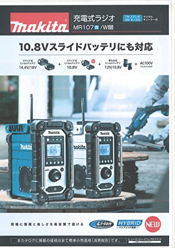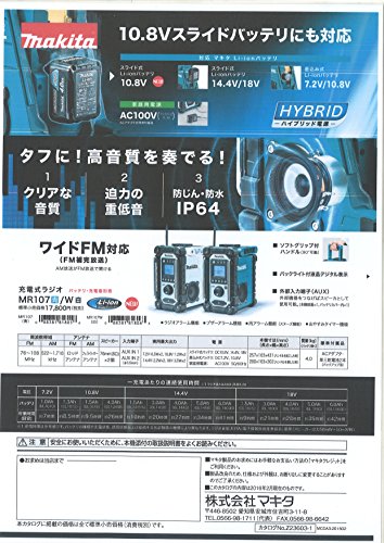 ワイドFM対応 (AMがFMで聞ける) 防水保護等級「IP64」生活防水仕様 高耐久構造 新たに10.8Vスライドバッテリ「BL1015」、「BL1040」も対応。 お手持ちのマキタバッテリで使え、 家庭用電源でも使用可能