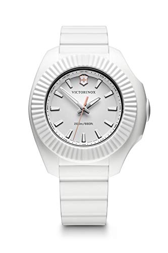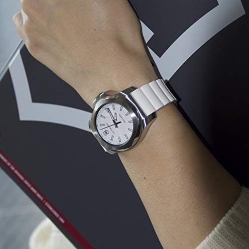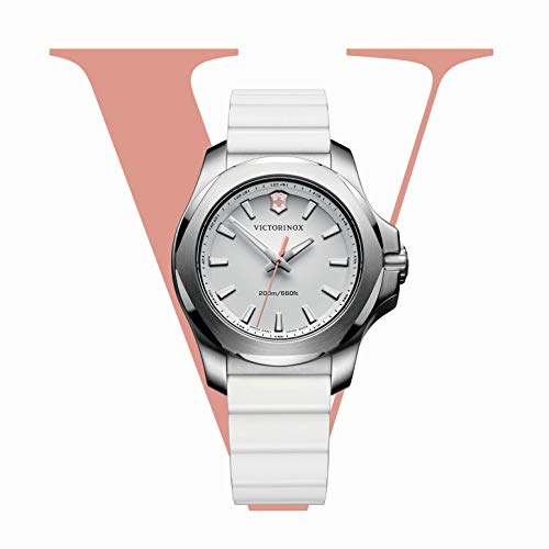 力強い美しさを感じるビクトリノックスのレディースラインナップのI.N.O.X. V。実力ある現代女性にふさわしい、モダンで高性能、おしゃれであらゆるシーンで活躍するスタイリッシュなレディース腕時計です。高い耐久性と堅牢さを兼ね備え20気圧防水。フレッシュで個性的なホワイトの配色はどんなコーディネートにも合わせやすいカラーリングでレディースに大人気。価格は70,000円程度です。