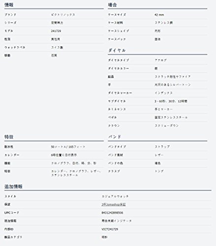 出典: https://www.amazon.co.jp/%E3%83%93%E3%82%AF%E3%83%88%E3%83%AA%E3%83%8E%E3%83%83%E3%82%AF%E3%82%B9-Victorinox-Chronograph-Automatic-241722/dp/B01N1WFGSD/ref=sr_1_2?s=watch&ie=UTF8&qid=1522141137&sr=1-2&keywords=Victorinox%E3%80%80241722ムーブメント 機械式(メカニカル自動巻き ) ダイヤルカラー ダークグレー ブレスレット素材 ステンレススチール ブレスレットカラー シルバー ベゼル 双方向回転ベゼル 直径 45 mm 機能 シースルーケースバック 日付 ねじ込み式スクリューケースバック クロノグラフ 耐傷性サファイアクリスタル、無反射トリプルコーティング ミリタリータイム 計算尺 防水 10気圧(100m)防水