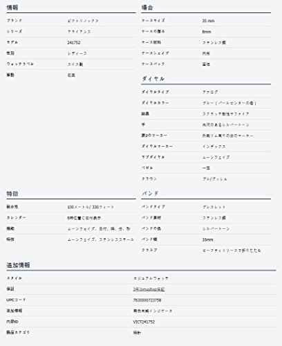 ムーブメント クォーツ ダイヤルカラー ブルー ブレスレット素材 レザー ブレスレットカラー ブルー 直径 35 mm 機能 ねじ込み式スクリューケースバック 日付 ムーンフェイズ 耐傷性サファイアクリスタル、無反射トリプルコーティング EOL表示(電池切れ表示) 防水 10気圧(100m)防水