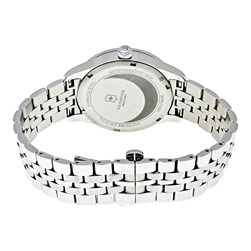 落ち着いた大人の雰囲気。オフィスでもディナーでも光り輝くあなたにピッタリなビクトリノックスのアライアンスレディースです。ムーンフェイズ機能と6時の位置にオーセンティックなブリリアントカットのダイヤモンドを配置しています。コンパクトながらも高級感があり、洗練された都会的なおしゃれレディースにぴったりです。ムーブメントはクオーツ。直径は35ミリ10気圧防水です。価格は80,000円程度です。