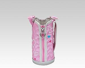 ハートをモチーフにして、全体がピンク色のかわいい見た目な、女性・子供向けの水筒カバーです。簡単取り付けのファスナーにも、ハートの飾りが付いているのがポイント。ベルト付きで持ち運びを楽にします。0.6~1.0リットルまで各種のサイズがあります。この水筒は、女子のお出かけやお弁当タイムにはぴったりでしょう。