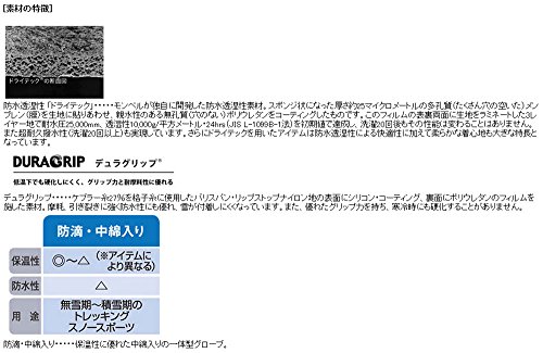 モンベル独自のドライテック素材を表地に使っています。この素材は、防水だけでなく透湿効果も高いのが特徴です。中綿は、湿気や水に強いポリエステル素材を使用し防寒にも優れている手袋です。裏地は、速乾性の高い起毛素材を施しモンベルの手袋の中でも保温性に優れたレディース用手袋だといえるでしょう。