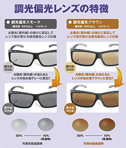 太陽光に当たるだけで色が変化する変色調光サングラスになります。屋外のシーンではレンズの色が変化して、室内へと入るとレンズカラーが薄くなっていきます。紫外線の量によりレンズカラーの濃さも変わっていきます。夏の日差しが強い日などは特にレンズカラーが濃くなり、眩しさを防いでくれるUV400カットによって、眼への疲労感を和らげてくれる効果を得ることが出来ます。