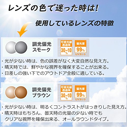二色の調光スモークと調光ブラウンカラーが揃っているサングラスになります。太陽光がレンズに当たるだけで色が変化してくれて、長時間のサイクリング時も光の乱反射を防いでくれて、前方の視界良好で安全に運転することが可能です。太陽光からの有害な紫外線もカットしてくれますので目元を日焼けすることなく快適に使用することが可能です。