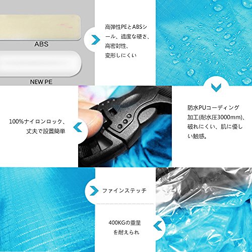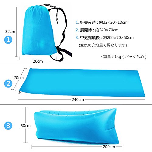新型エアソファー: 使用時サイズ:横幅260cm / 奥行70cm / 高さ50cm-70cm空気量により変動。収納時サイズ:18cm×35cm×10cm 重量グラム:1.3kg:2950円