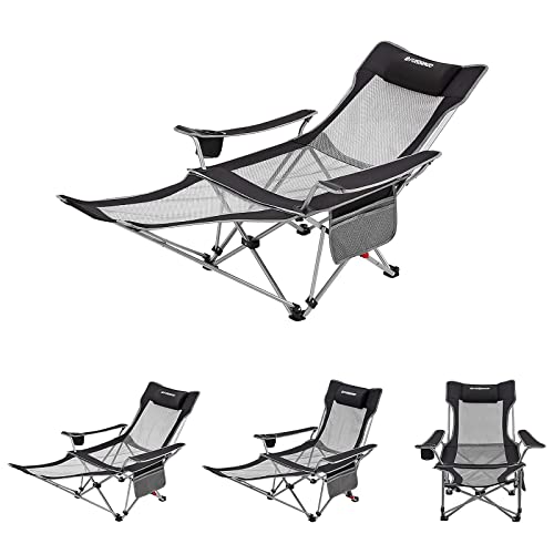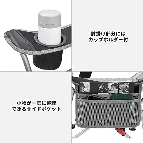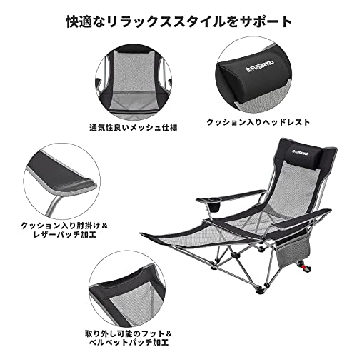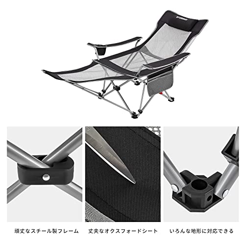 足を置く部分や、3段階のリクライニングが付いており、座り心地のよいアウトドアチェアです。サイドにはドリンクポケットが付いて小物入れに。通気性のいいメッシュで、場所を選ばず快適に過ごせるでしょう。