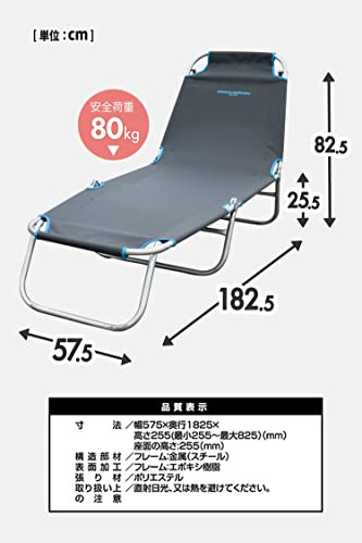 ●使用時サイズ(約):57.5✕182.5✕82.5cm ●収納時サイズ(約):58✕66✕8cm ●重量(約):5kg ●耐荷重(約):80kg ●材質(シート):ポリエステル/(フレーム):スチール
